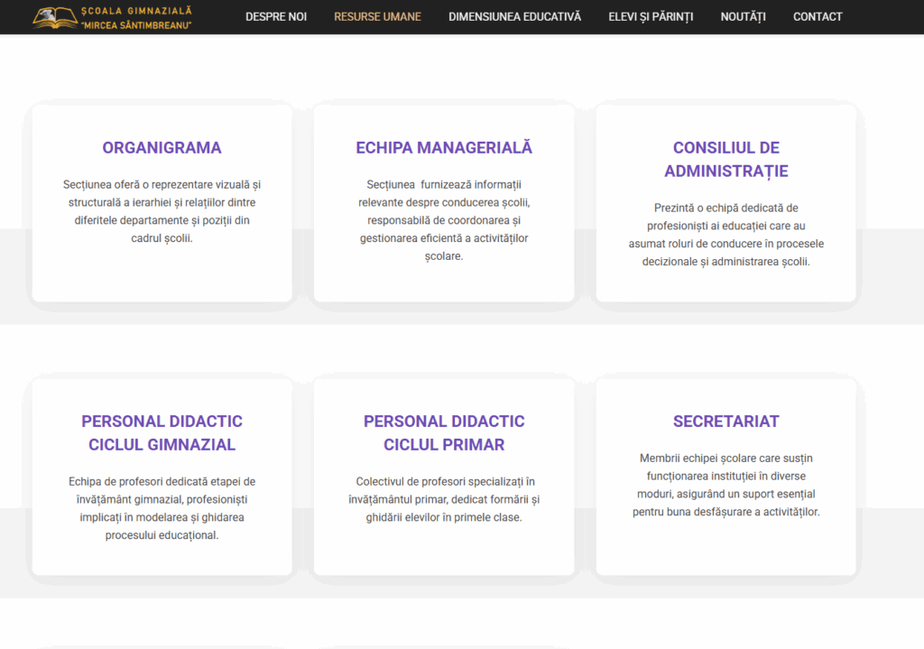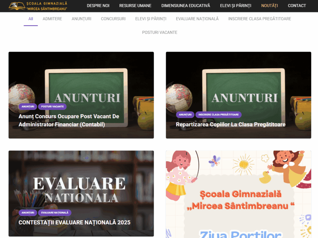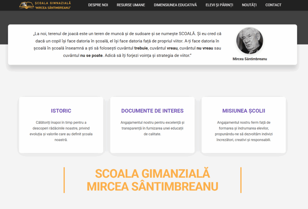 Website-ul pentru Scoala Gimnaziala Mircea Santimbreanu reprezinta dorinta noastra de a oferi inapoi comunitatii si de a promova dedicarea si iubirea pentru educatie. Website-ul beneficiaza de o structura clasica, usor de intuit si utilizat atat de catre elevi cat si de parinti. Blogul a fost tranbsformat in sectiunea de anunturi, prin intermediul careia unitatea de invatamant transmite in mod eficient si rapid informatii pentru partile interesate.
